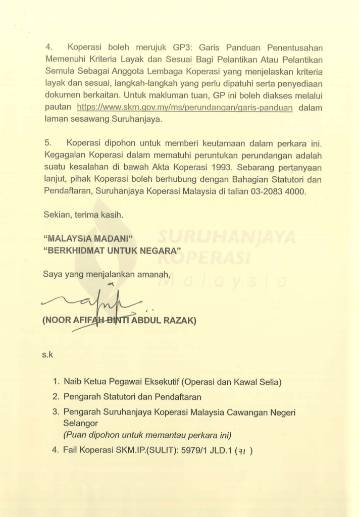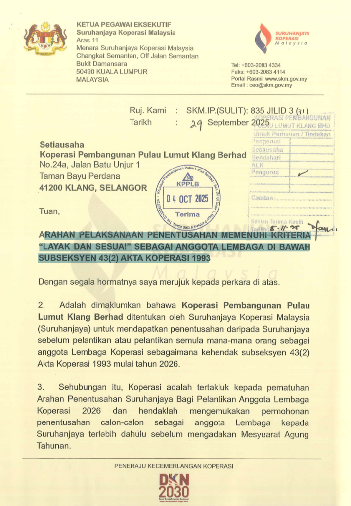 Adalah dimaklumkan bahawa Koperasi Pembangunan Pulau Lumut Klang Berhad ditentukan oleh Suruhanjaya Koperasi Malaysia(Suruhanjaya) untuk mendapatkan penentusahan daripada Suruhanjaya sebelum pelantikan atau pelantikan semula mana-mana orang sebagai anggota Lembaga Koperasi sebagaimana kehendak subseksyen 43(2) Akta Koperasi 1993 mulai tahun 2026
